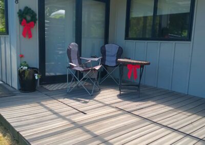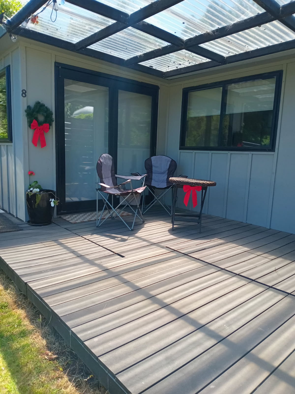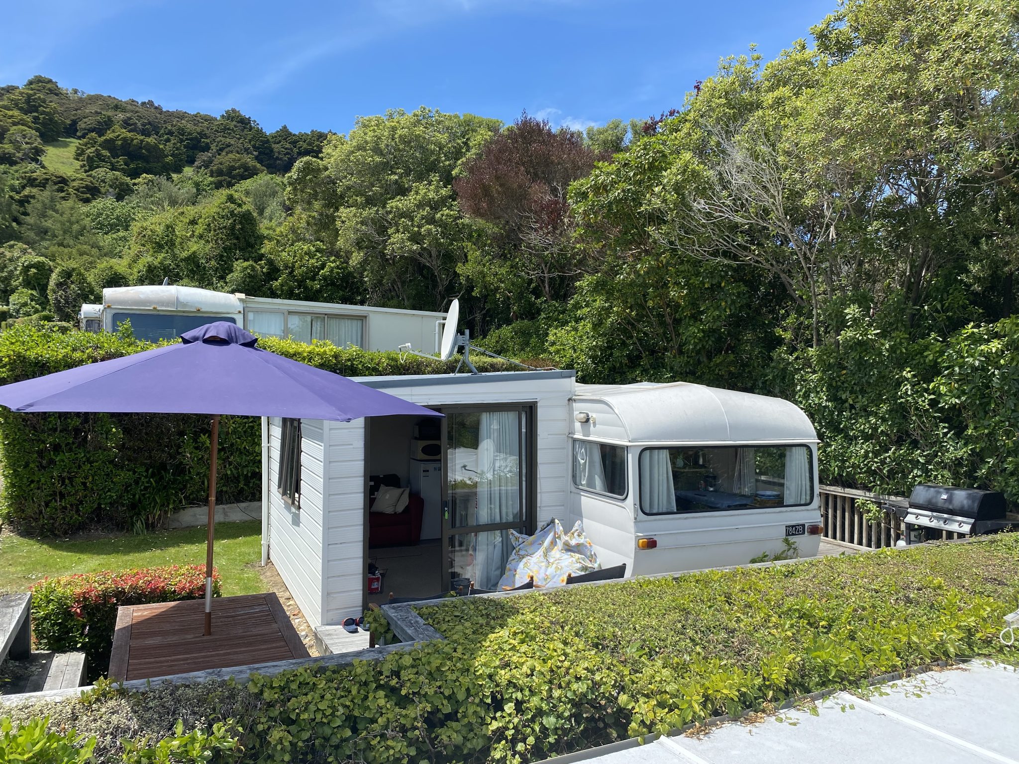 Has a large kwila deck wrapping around 2 sides of the caravan providing views of the harbour and shade from the summer sun.