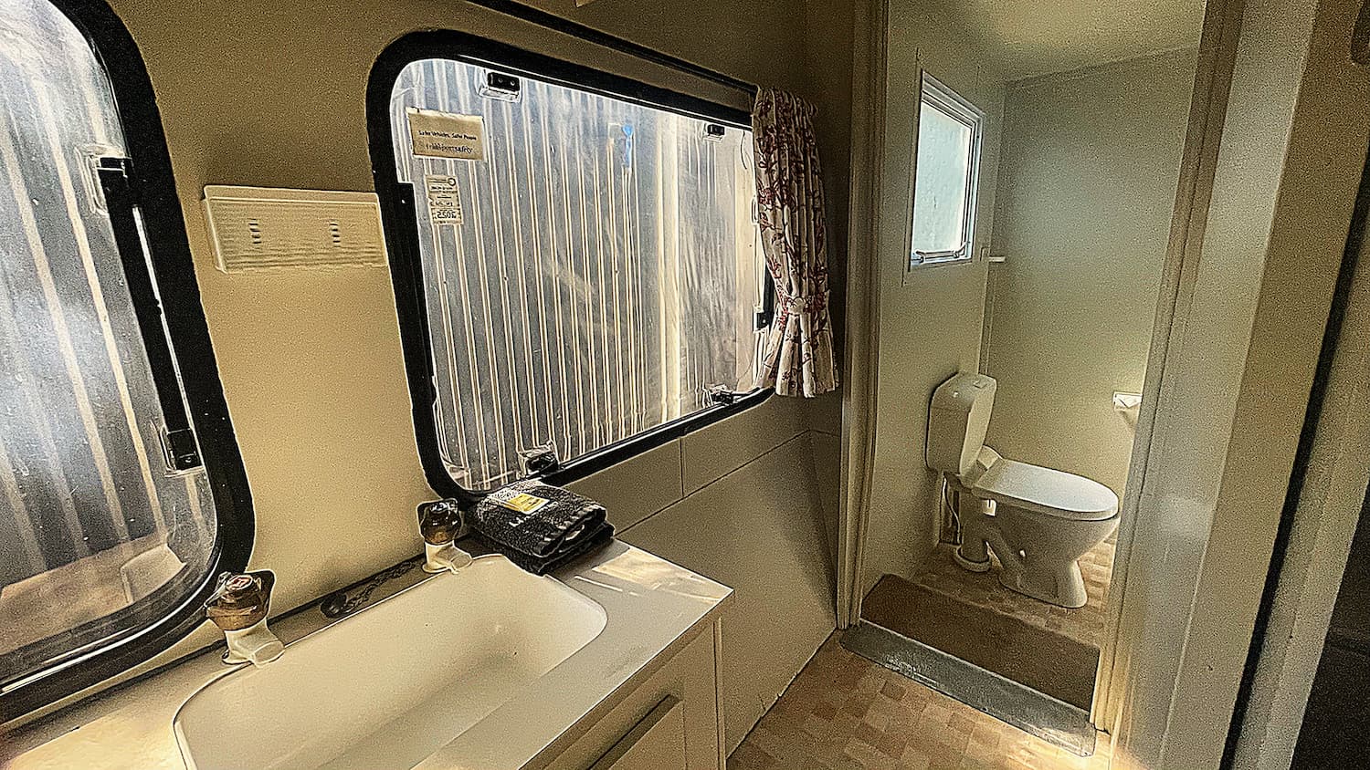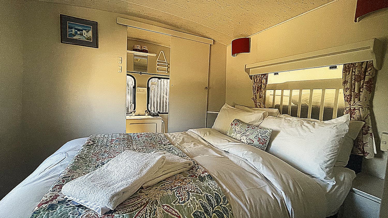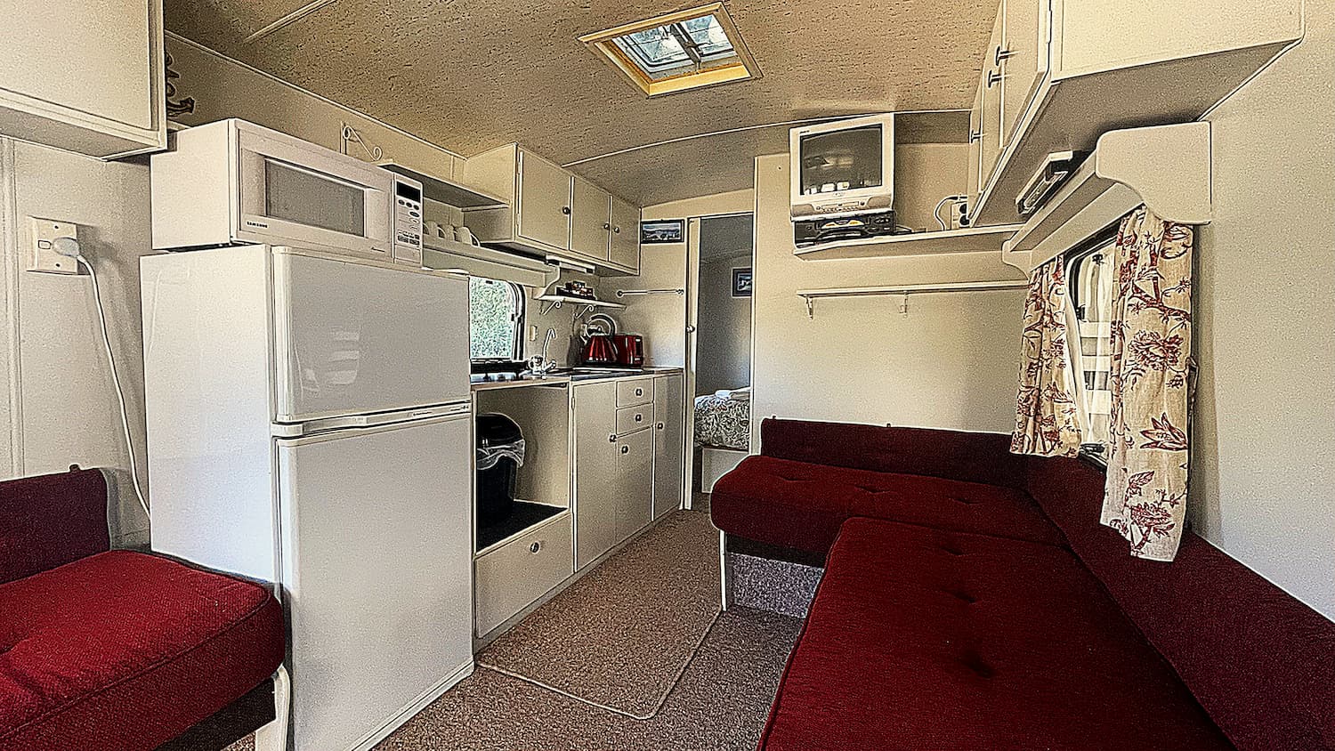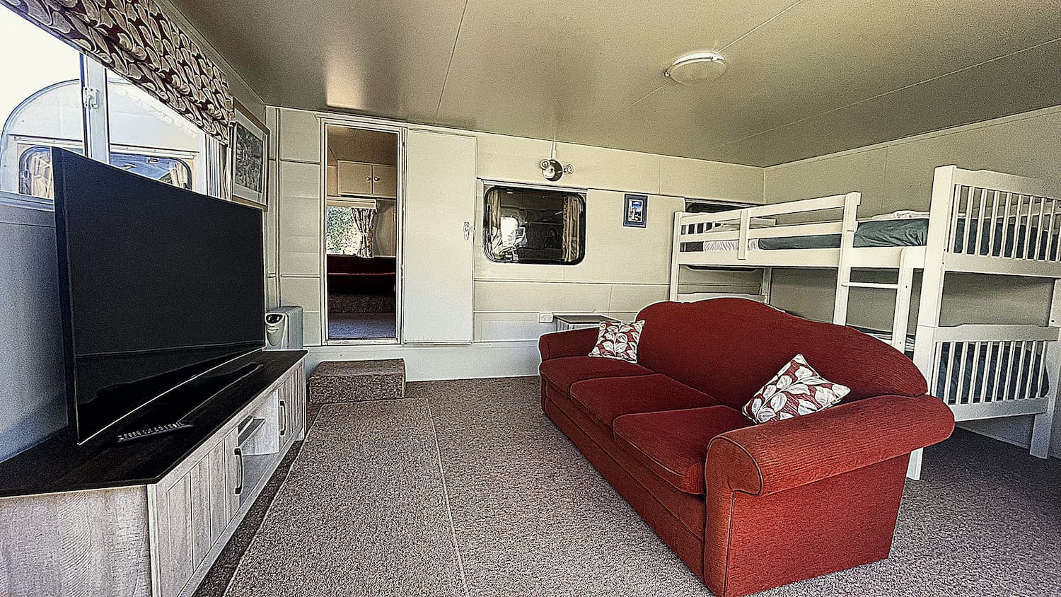This caravan is equipped with a double bed made up with linen and a separate living room with a set of king single bunks (Fold-out sofa bed available also). Plumbed shower and toilet, kitchen with microwave and stovetop. The spacious living room has a sofa, TV, chromecast and a heater.